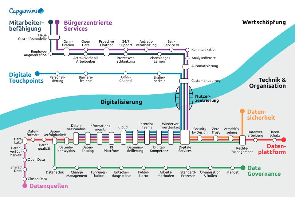 • Data Governance: Die Nutzung von Daten zur Entscheidungsfindung erfordert den Aufbau von Digitalkompetenzen sowie eine Weiterentwicklung der Arbeitskultur und den Organisationsstrukturen.