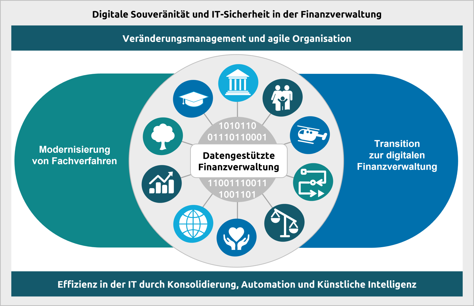 • Digitale Souveränität und IT-Sicherheit der Finanzverwaltung sind mehr denn je gebotene Bedingungen und benötigen für ihre Umsetzung die Verbindung von Strategie mit hohem technologischen Wissen.