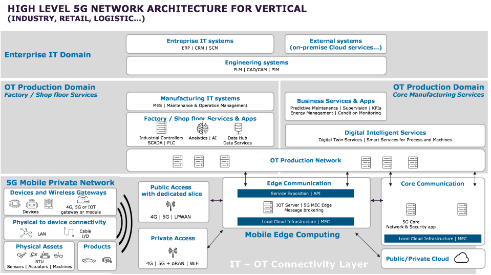Traditionell wurden IT- und OT-Systeme getrennt voneinander betrieben und verwaltet. IT-Systeme wurden von einer zentralen IT-Abteilung verwaltet, während OT-Systeme von der Produktionsabteilung betrieben wurden. Dies führte oft zu einer Fragmentierung der Systeme und einer begrenzten Integration zwischen IT und OT. Mit der Einführung von 5G MPN wird die Konvergenz von IT und OT ermöglicht. Durch die Nutzung von 5G-Netzwerken können IT- und OT-Systeme miteinander verbunden und integriert werden (siehe Abbildung 2). Dies ermöglicht eine nahtlose Kommunikation und einen Austausch von Daten zwischen den verschiedenen Systemen.