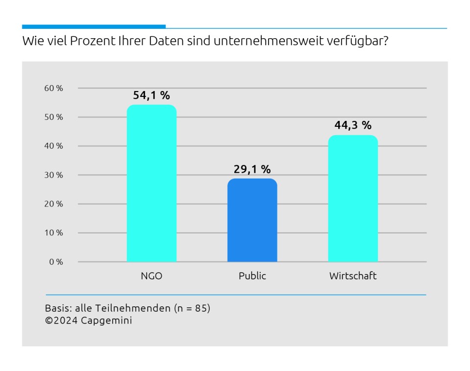 Da NGOs heute schon mehr als die Hälfte ihrer IT-Services bei Cloud-Anbietern einkaufen, können sie von deren KI-Angeboten profitieren. Dafür stehen ihnen, im Vergleich zu vielen Unternehmen, auch relativ viele Informationen zur Verfügung: Denn etwas mehr als die Hälfte ihrer Daten ist organisationsweit nutzbar, das sind etwa 10 Prozentpunkte mehr, als Unternehmen im Durchschnitt zur Verfügung stehen. Die übrigen Daten liegen in Datensilos oder können aufgrund gesetzlicher Vorgaben nicht genutzt werden.