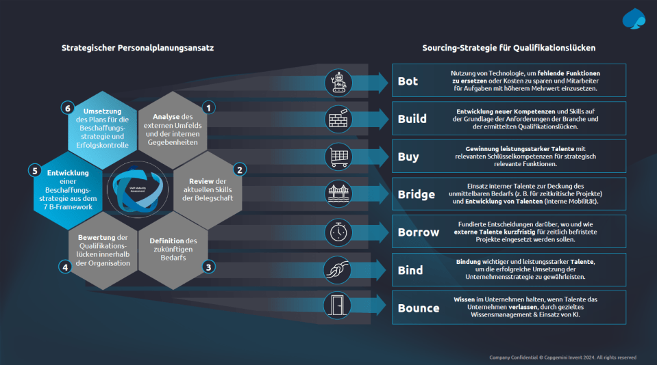 Nachdem die benötigten Fähigkeiten und der Bedarf an Personal, identifiziert wurden, um die zukünftigen Ziele der Institutionen zu erreichen, sollte mithilfe eines strategischen Personalplans dargelegt werden, welche Personalstrategie kurz- bis langfristig verfolgt wird. Capgemini Invent setzt hierbei auf seinen 7B-Ansatz (Grafik 1), der verschiedene Herangehensweisen zur Schließung der Kompetenzlücken berücksichtigt.