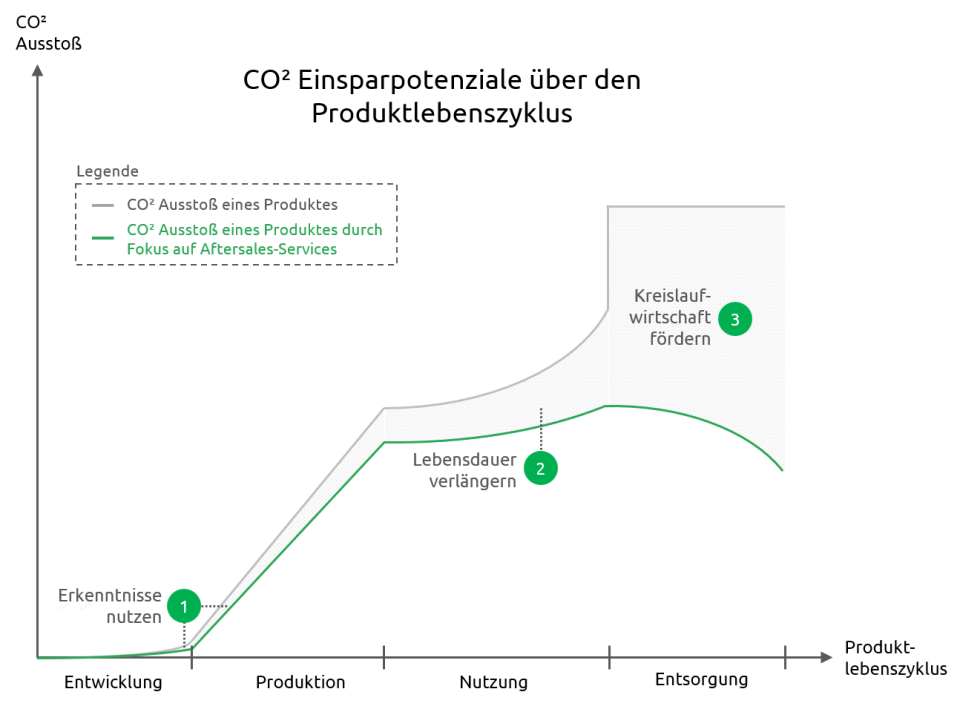 Aftersales-Services haben einen starken Einfluss auf die meisten indirekten Emissionen (Scope 3) während des Lebenszyklus von Produkten und Anlagen und können somit erhebliche Auswirkungen auf die Nachhaltigkeit der verarbeitenden Industrie haben (graue Fläche Abb. 1). Hersteller können nachhaltige Praktiken in die Bereitstellung von Dienstleistungen integrieren, um die Nachhaltigkeit zu verbessern und die Umweltbelastung zu reduzieren.