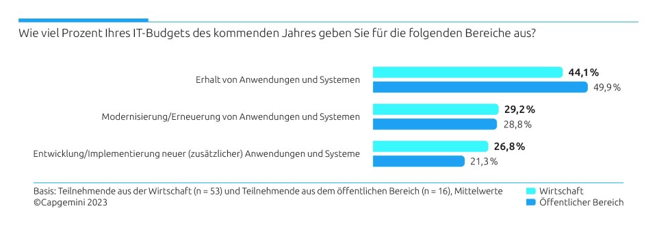 So plant beispielsweise der öffentliche Sektor für das kommende Jahr 2024, fast die Hälfte seiner IT-Budgets aufzuwenden, um den Status quo der IT zu erhalten. Hier macht sich bemerkbar, dass die Fördergelder für die Umsetzung des Onlinezugangsgesetzes wegfallen, mit welchen in erster Linie zusätzliche Systeme entwickelt und implementiert wurden. Dementsprechend sinkt der Budget-Anteil für neue Anwendungen und Infrastruktur, während der Anteil der Grundkosten steigt. Die Ausgaben für IT-Modernisierungen bleiben auf dem Niveau des Vorjahres.