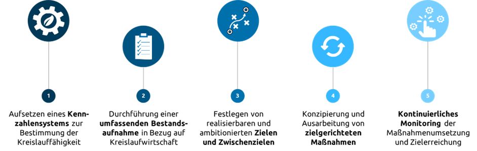 Die Erarbeitung einer strukturierten und zielgerichteten Strategie zur Umsetzung der Vorgaben des KrWG in den Bundesbehörden ist essenziell. Sie dient dazu, eindeutig festzulegen, wie die Kreislauffähigkeit der beschafften Produkte zu bestimmen ist. Außerdem beinhaltet sie klar definierte Ziele, Maßnahmen und Monitoring-Instrumente zur langfristigen Förderung von der Kreislaufwirtschaft. Insgesamt sollte die Strategie mit EMAS sowie dem Maßnahmenprogramm Nachhaltigkeit im Einklang stehen und Nachhaltigkeit und Kreislauffähigkeit ganzheitlich vorantreiben. Bei der Entwicklung der Strategie empfehlen wir einen fünfstufigen Ansatz, der in der nachfolgenden Grafik dargestellt wird.