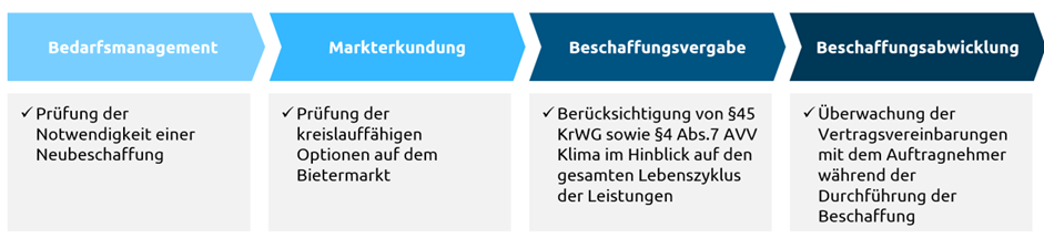 Die Kreislaufwirtschaft verfolgt das Ziel, den Wert von Produkten, Stoffen und Ressourcen so lange wie möglich zu erhalten, sodass Abfallmengen und Umweltbelastungen deutlich reduziert werden[4]. Im Jahr 2012 hat die Bundesregierung das Kreislaufwirtschaftsgesetz (KrWG) verabschiedet, um diese Idee voranzutreiben. Nach §45 KrWG werden Bundesbehörden dazu verpflichtet, ihren Beitrag zur Kreislaufwirtschaft zu leisten. Für das Verwaltungshandeln gilt somit die Pflicht zum Vorzug kreislauffähiger Produkte und Materialien, die beispielsweise ressourcenschonend, recyclingfähig, wiederverwendbar, schadstoffarm, langlebig, reparaturfreundlich oder abfallarm sind. Darüber hinaus verweist die AVV Klima in §4 Abs. 7[5] auf §45 KrWG und verankert damit die Berücksichtigung kreislaufbezogener Kriterien im Vergaberecht. In der folgenden Abbildung ist ersichtlich, wie Aspekte der Kreislaufwirtschaft in den öffentlichen Beschaffungsprozess integriert werden können.