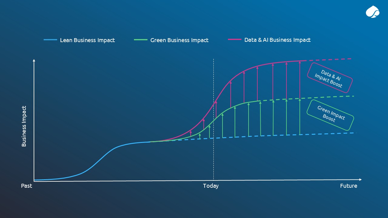 Die zweite Kurve visualisiert den „Green Business Impact“, und setzt am stagnierenden Lean Manufacturing an. Green Manufacturing baut auf Lean-Prinzipien auf und kombiniert diese mit Themen rund um Dekarbonisierung, Energie- und Ressourceneffizienz. Aktuell besteht noch viel Entwicklungspotenzial im Green Manufacturing, weshalb ein großer Einfluss auf den Unternehmenserfolg erzielt werden kann. Mögliche Maßnahmen sind zum Beispiel Energiemanagementsysteme oder ein Controlling der Ressourcenverbräuche und Emissionen.