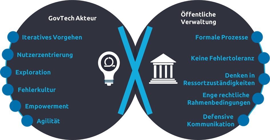 Durch die Beschreibung wird deutlich, dass diese beiden Kulturen nur schwerlich zueinander passen. Dieses Spannungsverhältnis zeigt sich unmittelbar, wenn Start-Ups und Verwaltung miteinander kooperieren. Für Start-Ups sind häufig die langwierigen Prozesse der Verwaltung ein Problem, da diese zum einen potenzielle Investoren zurückschrecken lassen und zum anderen langfristige Garantien erfordern, die insbesondere junge Start-Ups noch nicht geben können. Für die öffentliche Verwaltung kann die Zusammenarbeit mit Start-Ups Ängste auslösen, da sich der Umgang mit Unsicherheit fundamental vom Fokus auf Verlässlichkeit und Sicherheit unterscheidet.