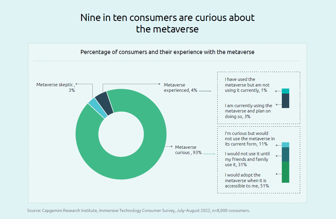 Im Allgemeinen steckt das Metaverse derzeit noch in den Kinderschuhen. Das gilt sowohl für die Technologie und Interoperabilität, als auch für die Marktdurchdringung bei Nutzern und Konsumenten. Unter unseren Befragten gaben nur 4 Prozent an, schon einmal tatsächlich Erfahrung mit dem Metaverse gemacht zu haben. Allerdings sagten 93 Prozent der Konsumenten, dass sie bereits eine Neugier für das Metaverse entwickelt haben – und von diesen würden 51 Prozent das Metaverse auch nutzen, sobald sie Zugang dazu haben. Der Großteil der Metaverse-Neugierigen möchte es eher für Interaktionen im privaten Umfeld nutzen (43 Prozent), gefolgt von Nutzung im Arbeitsumfeld (39 Prozent) und Gaming (33 Prozent). Erst dann kommen kommerzielle Kaufanwendung (28 Prozent), sowie Nutzung von Produkten und Services (27 Prozent).