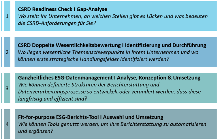 Mit unserem vierstufigen Ansatz adressieren wir die genannten und weitere künftige Herausforderungen im Rahmen der CSRD-Berichterstattung: