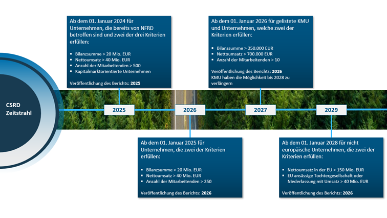 Im November 2022 hat das Europäische Parlament die neue EU-Richtlinie zur Nachhaltigkeitsberichterstattung verabschiedet. Die am 05. Januar 2023 in Kraft getretene Corporate Sustainability Reporting Directive (CSRD) löst die Richtlinie für nichtfinanzielle Berichterstattung (NFRD) ab und soll positiv zum European Green Deal beitragen. Ziel ist die Schaffung von Transparenz zur Sicherstellung einer einheitlichen Berichterstattung der ESG-Informationen von Unternehmen. Die Berichtspflicht wird stufenweise eingeführt, beginnend ab dem Berichtsjahr 2025 bis 2029. Das Jahr der verpflichtenden Berichterstattung ist dabei an folgende Kriterien geknüpft.