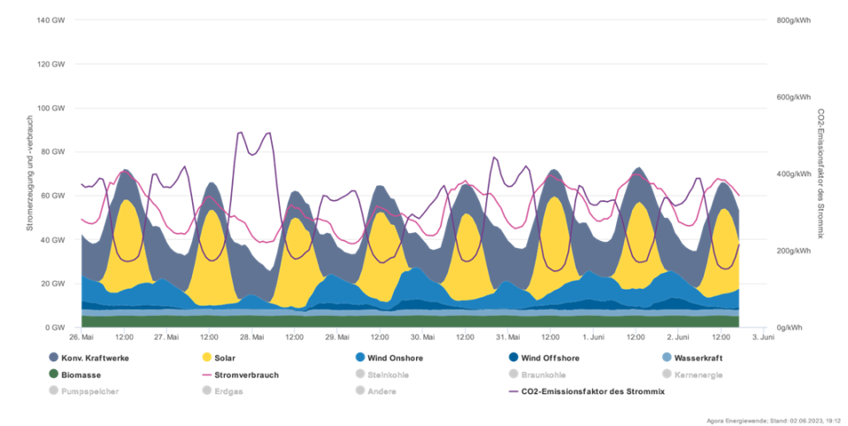 Abb. 2: Strommix und -verbrauch in Deutschland vom 26.05.2023 bis 02.06.2023. Quelle: Agorameter von Agora Energiewende.