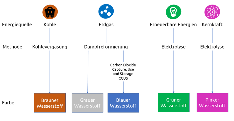 Bei dem in Deutschland bislang vorherrschenden grauen Wasserstoff (s. Abb. 1), der mit Erdgas hergestellt wird, fallen noch rund 10 kg CO2e pro Kilogramm Wasserstoff an. Allerdings kostet grauer Wasserstoff derzeit 4,5ct/kWh, grüner Wasserstoff hingegen noch 15-18ct/kWh.