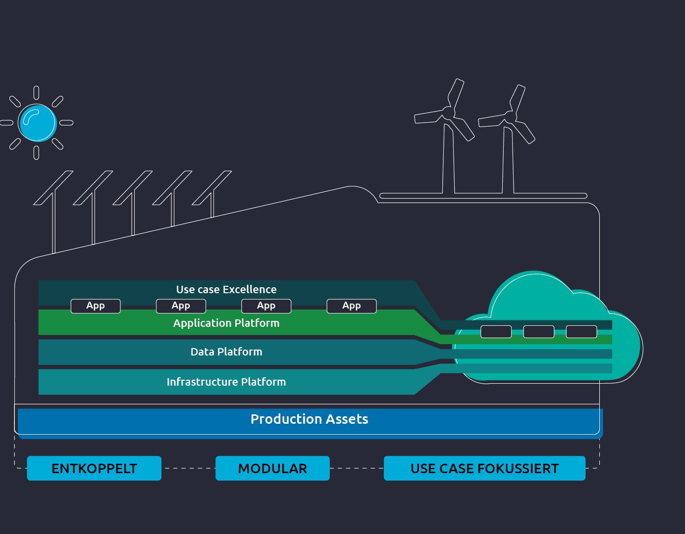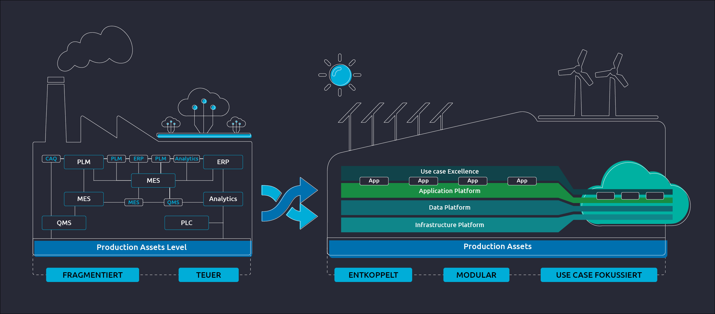 Unser E2E-Framework ermöglicht unsere Kunden in allen Transformationsphasen hin zu plattformzentrierten Produktionsökosystemen zu unterstützen.