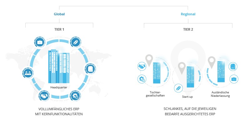 Im Mittelpunkt steht die hybride IT-Landschaft, die das Beste aus beiden Welten vereint: Stabilität und Kontrolle durch bestehende On-Premise-Systeme, kombiniert mit der Innovationskraft und Skalierbarkeit der Cloud. Besonders wirkungsvoll ist dabei der Two-Tier-ERP-Ansatz: Zentrale Prozesse (Tier 1) werden über SAP Cloud ERP gesteuert, während Tochtergesellschaften, neue Geschäftsbereiche oder Akquisitionen (Tier 2) flexibel und unabhängig in der Cloud betrieben werden können. So gelingt der Umstieg schrittweise, risikoarm und anpassungsfähig.