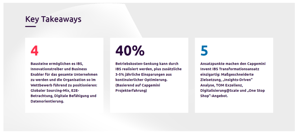 Unsere Erfahrungen in den verschiedensten Industrien und bei Kunden unterschiedlicher Größe zeigen, dass es stets Raum für messbare Optimierungen gibt. Der Capgemini Invent IBS Transformationsansatz differenziert sich durch 5 wesentliche Eckpfeiler (Abbildung 4):