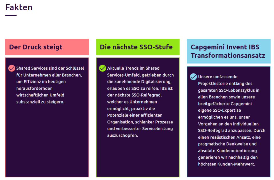Stellen Sie sich vor, Shared Service Organisationen (SSOs) werden zu Innovationstreibern und Business Enablern, die Ihr Unternehmen mit erstklassigen Services und virtueller Arbeitskraft unterstützen. Wir bei Cagemini Invent heben Shared Services mittels „Insights-Driven“ Tools, innovativer Target Operating Model Expertise und skalierbarer „State of the Art“ Digitalisierungs- und Automatisierungslösungen auf die nächste Stufe – alles basierend auf einer ganzheitlichen „One-Stop-Shop“-Erfahrung: von der Strategie über das Design bis hin zur Implementierung. Wir machen SSOs zum zentralen Transformationsmotor der gesamten Organisation, um Ihr Unternehmen im Wettbewert führend zu positionieren.
