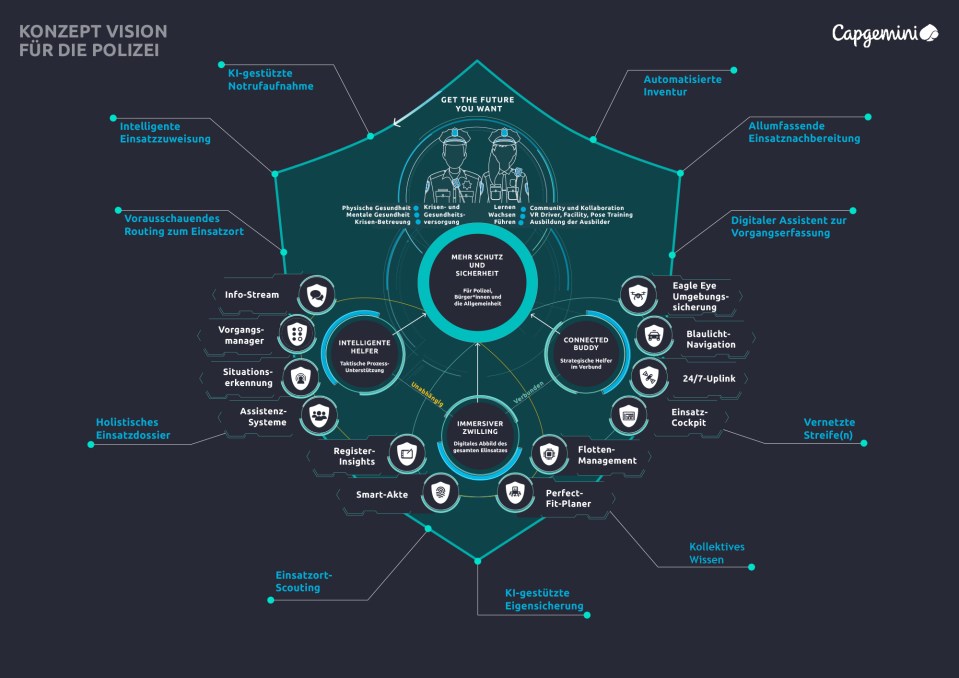 Capgemini unterstützt Sie gerne in Ihrer digitalen Transformation und möchte die Zukunft positiv gestalten. Dabei achten wir bewusst auf die Herausforderungen, die sich am Horizont abzeichnen. Für die Polizei der Zukunft hat Capgemini ein innovatives und visionäres Konzept entworfen. Es inspiriert und eröffnet einen Gestaltungs- und Möglichkeitsraum. Mit dem Menschen im Mittelpunkt verknüpft die Vision digitale und analoge Technologien mehrwertstiftend und lässt sie flexibel und nahtlos vernetzt, zusammenspielen.