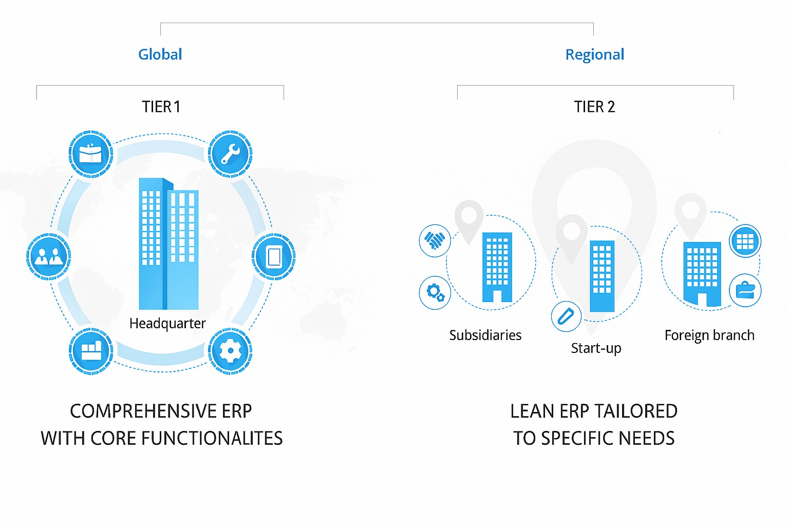 The two-tier ERP approach is especially effective: central processes (Tier 1) are managed via SAP Cloud ERP, while subsidiaries, new business units, or acquisitions (Tier 2) operate flexibly and independently in the cloud. This enables a gradual, low-risk, and adaptable transition.