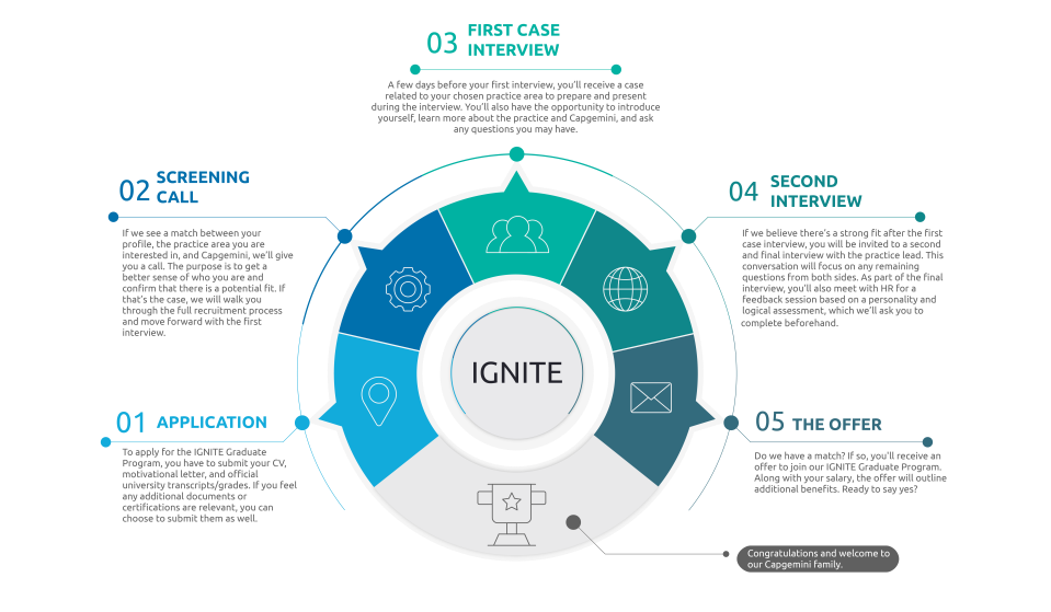 When joining IGNITE, you choose a career path – a customized education and development program to build your skills in the field of your choice. It’s an aggregate of teacher-led training, certifications, and self-study from a wide range of educational materials that will boost your role as an associate consultant at Capgemini. You’ll also apply your learning and gain immediate experience on customer assignments at our biggest clients. And, of course, there will be many team-building activities with your close-knit group of IGNITE colleagues.