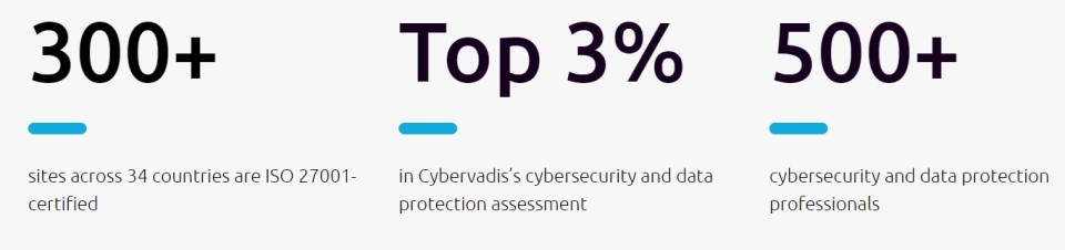 Nuestra estrategia de ciberseguridad, en vigor desde 2014, se centra en: gestionar las amenazas internas y externas; establecer mecanismos de confianza dentro de nuestro ecosistema y en toda nuestra organización; y cumplir con los requisitos legales y estándares de seguridad (con ISO 27001 como línea de base). Cada mes, producimos tableros de incidentes y una tarjeta de puntuación de riesgo cibernético que cubre 16 elementos sobre tecnología, factores humanos, riesgos externos, proveedores, cumplimiento y aplicación de políticas.
