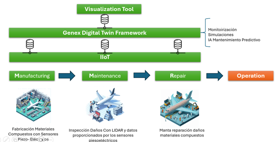El proyecto GENEX, financiado por la UE, está desarrollando una plataforma end-to-end basada en IIoT y gemelos digitales para la optimización de la fabricación y el mantenimiento de estructuras compuestas de aeronaves de próxima generación. Estos modelos incorporan conocimiento sobre los componentes de las aeronaves y los procesos de fabricación/reparación para su optimización. Además, permiten el desarrollo de un sistema de monitorización y gestión de la salud y uso de las aeronaves, para garantizar la seguridad y la aeronavegabilidad.