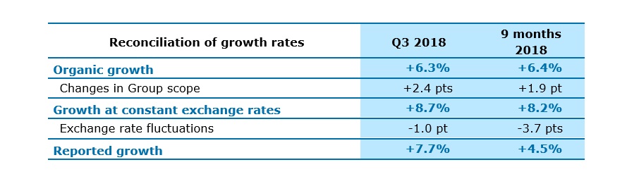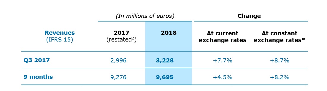 Group growth remained strong during the quarter despite a high Q3 2017 comparison basis. Revenues totaled €3,228 million, up 7.7% year-on-year at current exchange rates and 8.7% at constant exchange rates. Organic growth* (i.e. excluding the impact of currency fluctuations and changes in Group scope) was 6.3%.