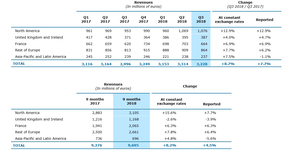 Paris, October 24, 2018 – The Capgemini Group achieved consolidated revenues of €3,228 million in Q3 2018, up 8.7% year-on-year at constant exchange rates*.