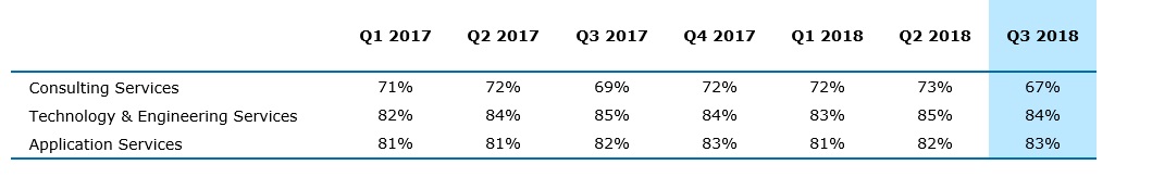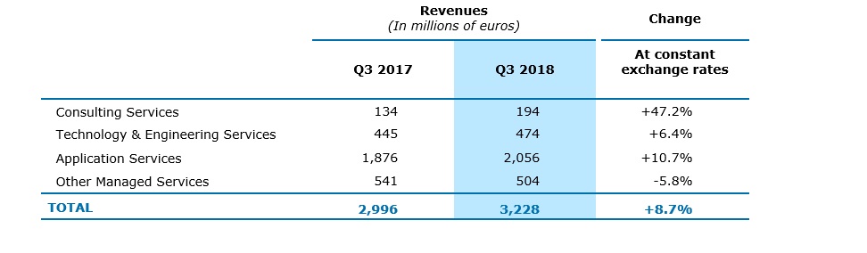 Application Services (64% of Group revenues) continue to benefit from customer demand related to new Digital and Cloud needs and maintained a high rate of growth. Q3 revenue increased 10.7% at constant exchange rates, with all regions reporting high single digit to double digit growth rates.