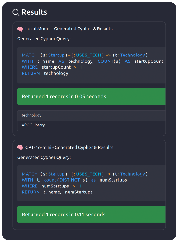 An example query used for benchmarking: “Which technologies are used across multiple startups?”