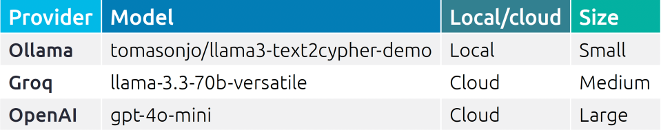 Note that the tomasonjo/llama3- text2cypher-demo is finetuned to handle text-to-cypher. It is open source, based on the llama3 model, and can run fully locally on a laptop.
