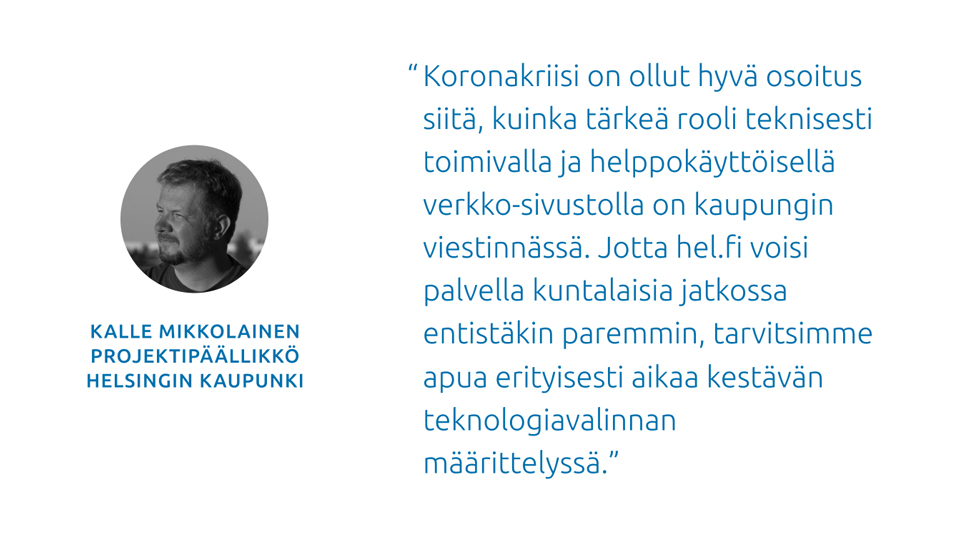 “Koronakriisi on ollut hyvä osoitus siitä, kuinka tärkeä rooli teknisesti toimivalla ja helppokäyttöisellä verkkosivustolla on kaupungin viestinnässä. Jotta hel.fi voisi palvella kuntalaisia jatkossa entistäkin paremmin, tarvitsimme apua erityisesti aikaa kestävän teknologiavalinnan määrittelyssä.”