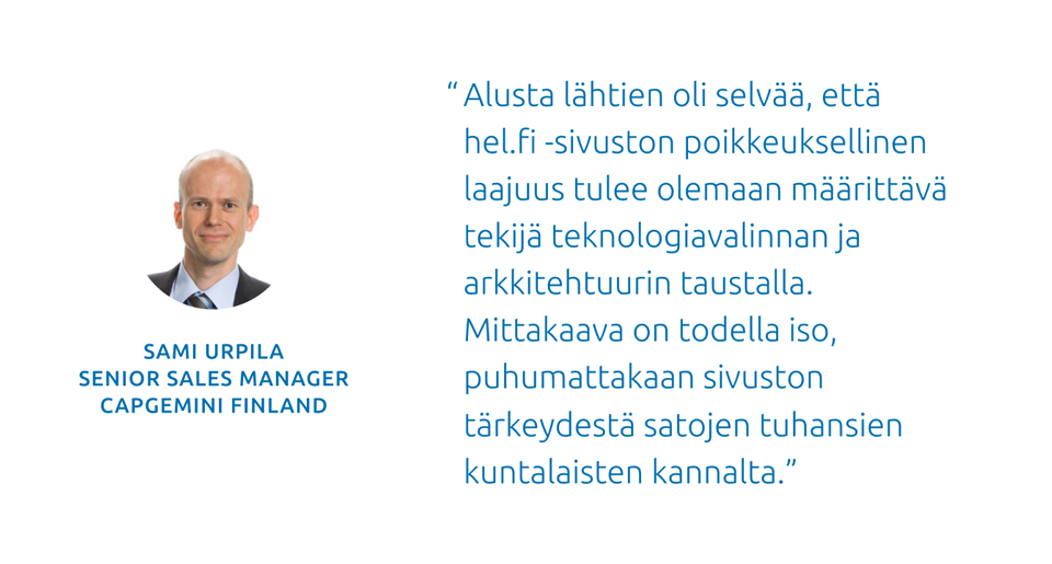 “Alusta lähtien oli selvää, että hel.fi -sivuston poikkeuksellinen laajuus tulee olemaan määrittävä tekijä teknologiavalinnan ja arkkitehtuurin taustalla. Mittakaava on todella iso, puhumattakaan sivuston tärkeydestä satojen tuhansien kuntalaisten kannalta.”