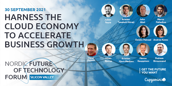 The cloud economy is the single most powerful force behind business acceleration and transformation. Cloud computing is thus more than a technology transformation driver – it’s a business transformation. This unique two-hour event will showcase the findings in this area from the Capgemini flagship Applied Innovation Exchange in San Francisco, Capgemini Nordics and our Silicon Valley based ecosystem of partners, from industry thought leaders, and from key Nordic companies.