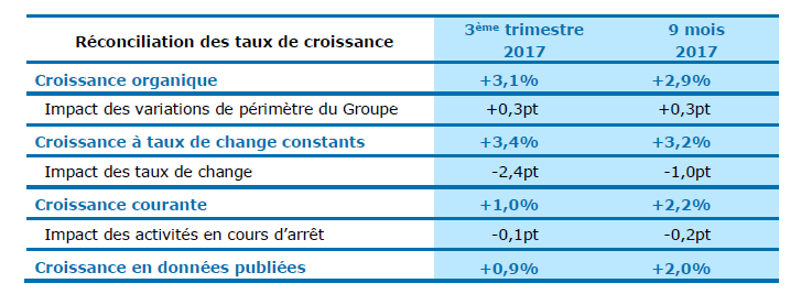 L’impact des variations des devises sur le troisième trimestre est principalement lié à la dépréciation de la livre sterling et du dollar américain par rapport à l’euro. L’ « impact des activités en cours d’arrêt » reflète l’évolution de l’activité de revente de matériel au Brésil qui avait généré 5 millions d’euros au 3ème trimestre 2016.