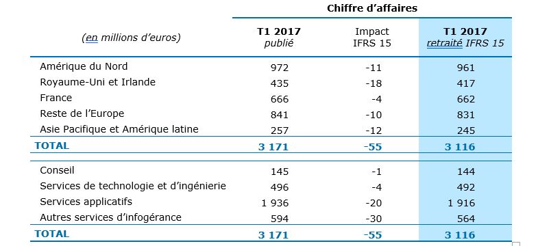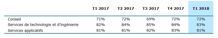 L’activité de Conseil (5% du chiffre d’affaires du Groupe), portée par les besoins de transformation digitale des entreprises, enregistre une hausse de 21,6% de son chiffre d’affaires à taux de change constants marquée une forte croissance en Amérique du Nord et en Europe, en particulier dans les Services financiers. Le chiffre d’affaires des Services de technologie et d’ingénierie (16% du chiffre d’affaires du Groupe) a crû de 4,2%, tiré par l’activité en France et en Amérique du Nord, avec ce trimestre une forte progression dans le secteur de l’Energie et des Utilities. Les Services applicatifs (63% du chiffre d’affaires du Groupe) sont le premier moteur de la croissance du Groupe avec une augmentation de 10,4% du chiffre d’affaires reflétant la bonne adéquation du portefeuille d’offres aux besoins du marché, notamment dans le Digital et le Cloud et en premier lieu dans les secteurs des Services financiers, de l’Industrie et des Biens de consommation. Les Autres services d’infogérance (16% du chiffre d’affaires du Groupe) enregistrent une baisse de 5,0% du chiffre d’affaires. Cette évolution est imputable à la baisse anticipée dans le secteur public au Royaume-Uni et aux Services d’infrastructure qui restent globalement sous pression en raison de la transition de leur portefeuille d’activité. Les activités de Business services (Business Process Outsourcing et plateformes) sont en croissance sur le 1er trimestre de l’année.
