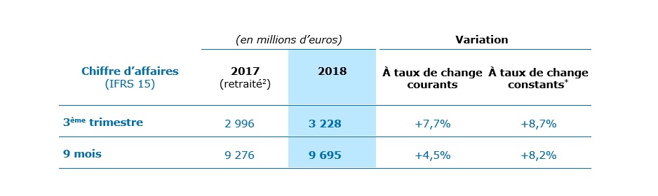 Le Groupe a maintenu une dynamique de croissance élevée sur le trimestre malgré une base de comparaison exigeante au 3ème trimestre de l’année dernière. Le chiffre d’affaires s’établit à 3 228 millions d’euros en progression sur un an de 7,7% à taux de change courants et de 8,7% à taux de change constants. La croissance organique* du Groupe, c’est-à-dire hors impact des devises et des variations de périmètre, atteint 6,3%.
