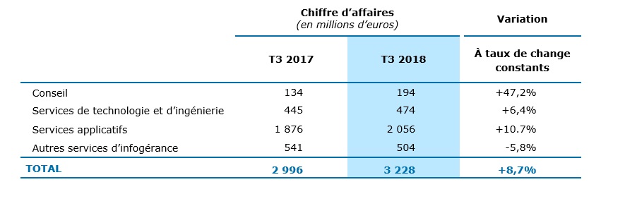 Paris, le 24 octobre 2018 – Le groupe Capgemini a réalisé au 3ème trimestre 2018 un chiffre d’affaires consolidé de 3 228 millions d’euros, en hausse de 8,7% à taux de change constants* par rapport au même trimestre de l’année 2017.