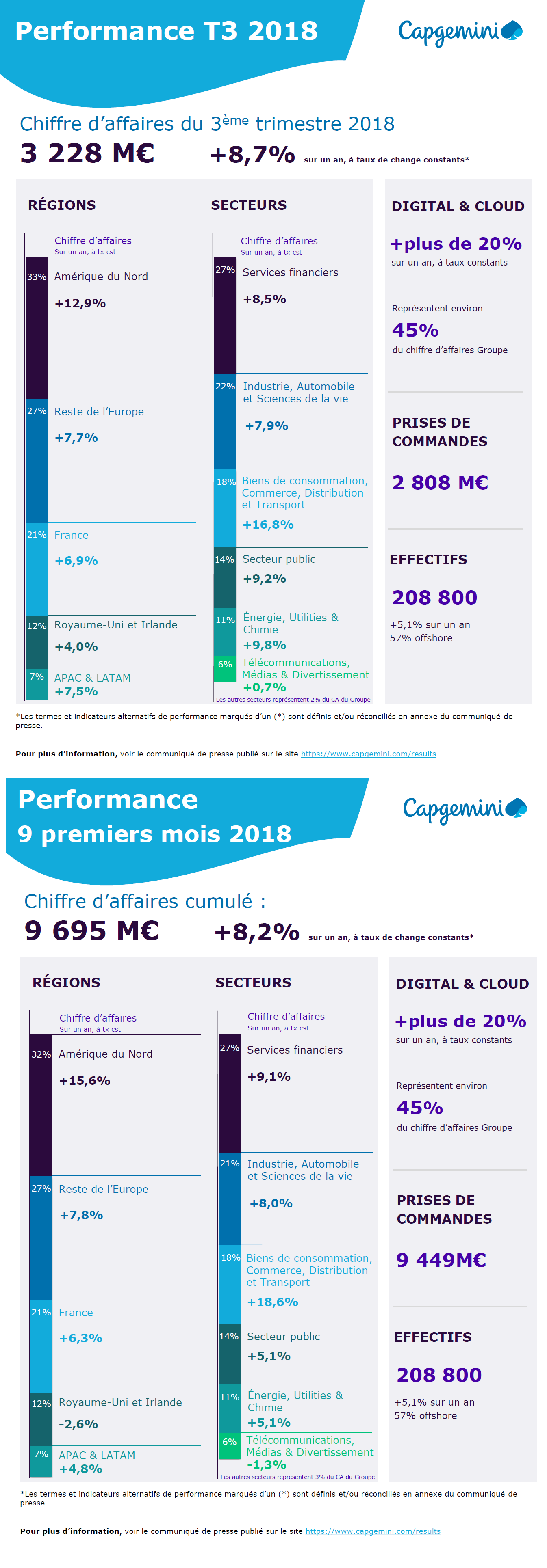 Pour Paul Hermelin, Président-directeur général du groupe Capgemini : « Nous avons poursuivi l’année sur un rythme de croissance soutenu tiré par le développement continu de nos activités dans le Digital et Cloud. La dynamique de l’Amérique du Nord, notre plus grand marché, se poursuit avec une progression du chiffre d’affaires à deux chiffres tandis qu’en Europe, le Royaume-Uni renoue avec la croissance et la France réalise un très bon trimestre.