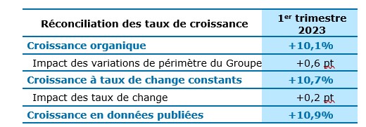 Le Groupe entame l’année 2023 sur une dynamique toujours robuste avec une croissance de son chiffre d’affaires de +10,7% à taux de change constants pour le 1er trimestre de l’exercice. La croissance organique – c’est-à-dire corrigée des impacts des devises et des variations de périmètre – s’élève à +10,1%, soit une décélération plus modérée qu’attendu par rapport à 2022 au regard de la base de comparaison élevée.
