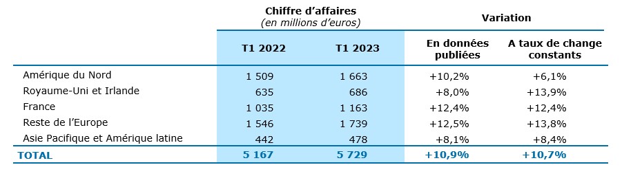 L’activité de la région Royaume-Uni et Irlande (12% du chiffre d’affaires du Groupe au 1er trimestre 2023) progresse de +13,9% à taux de change constants, alimentée par la forte croissance des secteurs de l’Industrie et des Biens de Consommation et la bonne tenue des Services Financiers et du Secteur Public.