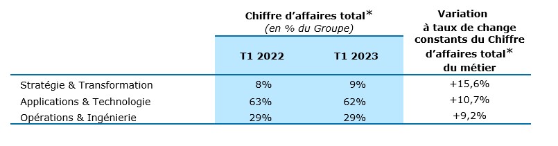 Ainsi les services en Stratégie & Transformation (9% du chiffre d’affaires du Groupe au 1er trimestre 2023) et en Applications & Technologie (62% du Groupe et cœur d’activité de Capgemini) affichent une croissance de leur chiffre d’affaires total* de +15,6% et +10,7% respectivement, à taux de change constants. Cette dynamique toujours solide, bien qu’en décélération par rapport à 2022 comme attendu, illustre la priorité donnée par les clients du Groupe à leurs projets stratégiques de transformation digitale.