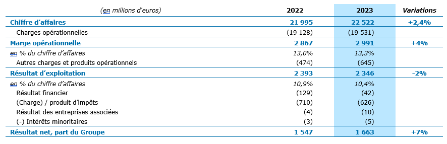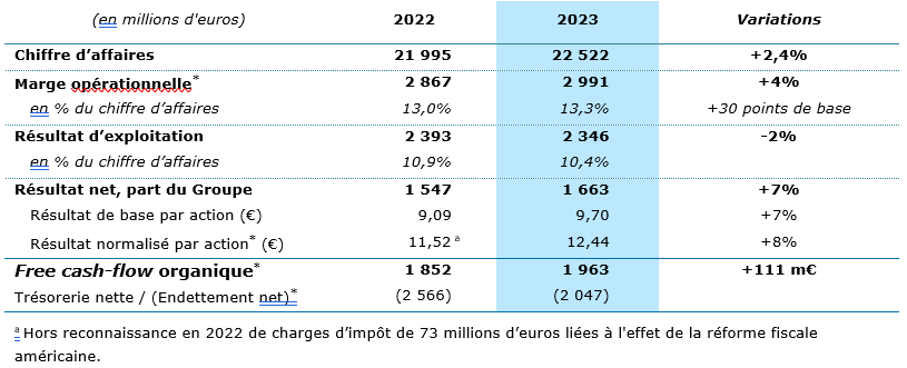En conséquence, la marge opérationnelle* atteint 13,3% du chiffre d’affaires, soit 2 991 millions d’euros, en hausse de +4% en valeur par rapport à 2022. Cette amélioration de 30 points de base est supérieure à l’objectif d’une progression de 0 à 20 points de base fixé pour 2023.