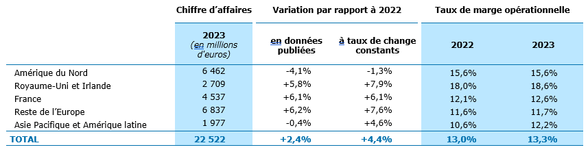 À l’inverse, le chiffre d’affaires de la région Amérique du Nord (29% du Groupe) s’est inscrit en léger recul de -1,3%. Le secteur de l’Industrie et celui des Services enregistrent une croissance solide. La baisse du chiffre d’affaires a été particulièrement visible dans les secteurs des TMT et des Biens de consommation & Commerce, mais plus limitée dans celui des Services Financiers. Le taux de marge opérationnelle de la région s’est élevé à 15,6% comme en 2022.