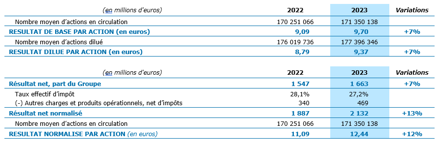 Après la prise en compte du résultat des entreprises associées et des intérêts minoritaires, le résultat net part du Groupe s’inscrit en hausse de +7% sur un an pour atteindre 1 663 millions d’euros. Le bénéfice par action (non dilué) progresse également de +7% à 9,70 euros. Le résultat normalisé par action*atteint 12,44 euros, comparé à 11,09 euros en 2022 et 11,52 euros avant reconnaissance de la charge d’impôt liée à l’effet de la réforme fiscale américaine.