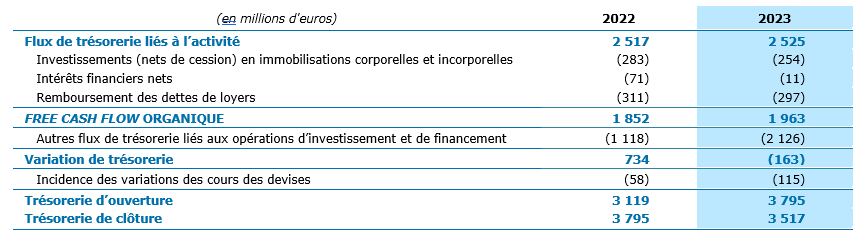 Le free cash-flow organique se définit comme le flux de trésorerie lié à l’activité diminué des investissements en immobilisations incorporelles et corporelles (nets des cessions), des remboursements des dettes de loyers et ajusté des intérêts financiers payés et reçus.