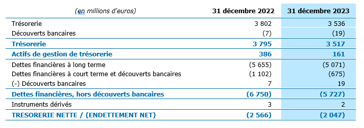 Au 31 décembre 2023, le Groupe dispose d’une trésorerie et d’actifs de gestion de trésorerie pour un montant total de 3,7 milliards d’euros. Compte tenu d’un encours de dettes financières de 5,7 milliards d’euros et des instruments dérivés, l’endettement net* du Groupe s’inscrit en baisse à 2,0 milliards d’euros, contre 2,6 milliards d’euros fin 2022.