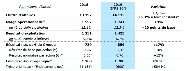 Le Groupe a réalisé en 2019 un chiffre d’affaires de 14 125 millions d’euros, en progression de 7,0% par rapport à celui de 2018. Cela représente une croissance de 5,3% à taux de change constants*, en ligne avec l’objectif de réaliser en 2019 une croissance « autour 5,5% » (objectif tel qu’ajusté lors de la publication du chiffre d’affaires du 3ème trimestre 2019). La croissance organique* du Groupe, c’est-à-dire hors impact des devises et des variations de périmètre, s’établit à 4,2%.