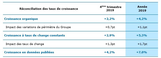 Comme prévu et annoncé lors de la publication de son chiffre d’affaires du 3ème trimestre 2019, le Groupe a enregistré une croissance moins dynamique au 4ème trimestre avec un chiffre d’affaires de 3 650 millions d’euros sur la période. L’augmentation de son chiffre d’affaires par rapport à la même période de 2018 s’établit ainsi à 2,9% à taux de change constants et 2,2% à taux de change et périmètre constants.