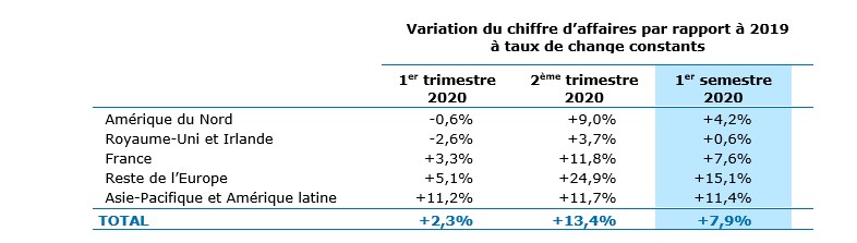 Sur le plan géographique, la croissance organique du 2ème trimestre a enregistré en France un ralentissement très marqué par rapport au rythme du 1er trimestre. Ainsi en dépit de la bonne dynamique du début d’année, la France a été, au 2ème trimestre, la région du Groupe ayant enregistré le plus fort recul en termes de croissance organique. A l’inverse, les régions Amérique du Nord, Royaume-Uni et Irlande et Asie-Pacifique et Amérique latine ont comparativement bien mieux résisté avec des croissances organiques au 2ème trimestre plus proches de celles du début d’année. Cette disparité peut être attribuée aux différences observées dans la durée et la rigueur des périodes de confinement et le mix sectoriel des différents pays.