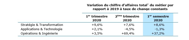 Comme anticipé dans un contexte de crise, les rythmes de croissance organique des services d’infrastructure cloud et de Business Services (les métiers d’Opérations) n’ont été que relativement peu affectés par le contexte, tandis que les métiers d’Ingénierie et de conseil en Stratégie et Transformation ont eu tendance à enregistrer un ralentissement plus marqué que la moyenne du Groupe. Les services d’Applications et de Technologie, qui constituent le cœur de l’activité du Groupe, ont quant à eux démontré une résilience légèrement supérieure à la moyenne du Groupe.